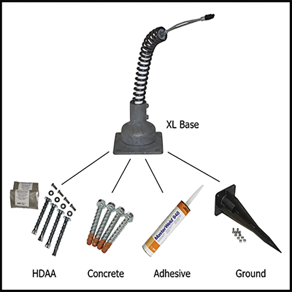 Anchoring Hardware included for Heavy-Duty Asphalt, Concrete or Natural Ground Surfaces (XL Ground Spike). Adhesive anchoring is also available.