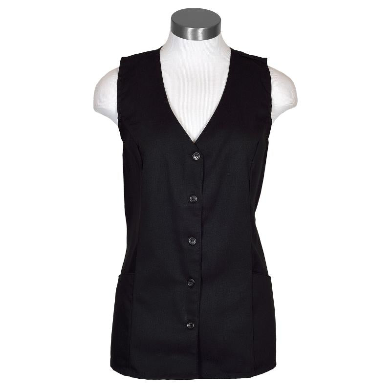 V93 flattering longer length vest has a classic form fitting shape. Vest details include tailored finished facing and five color-matched buttons. Made from home washable 65/35 poly/cotton twill.